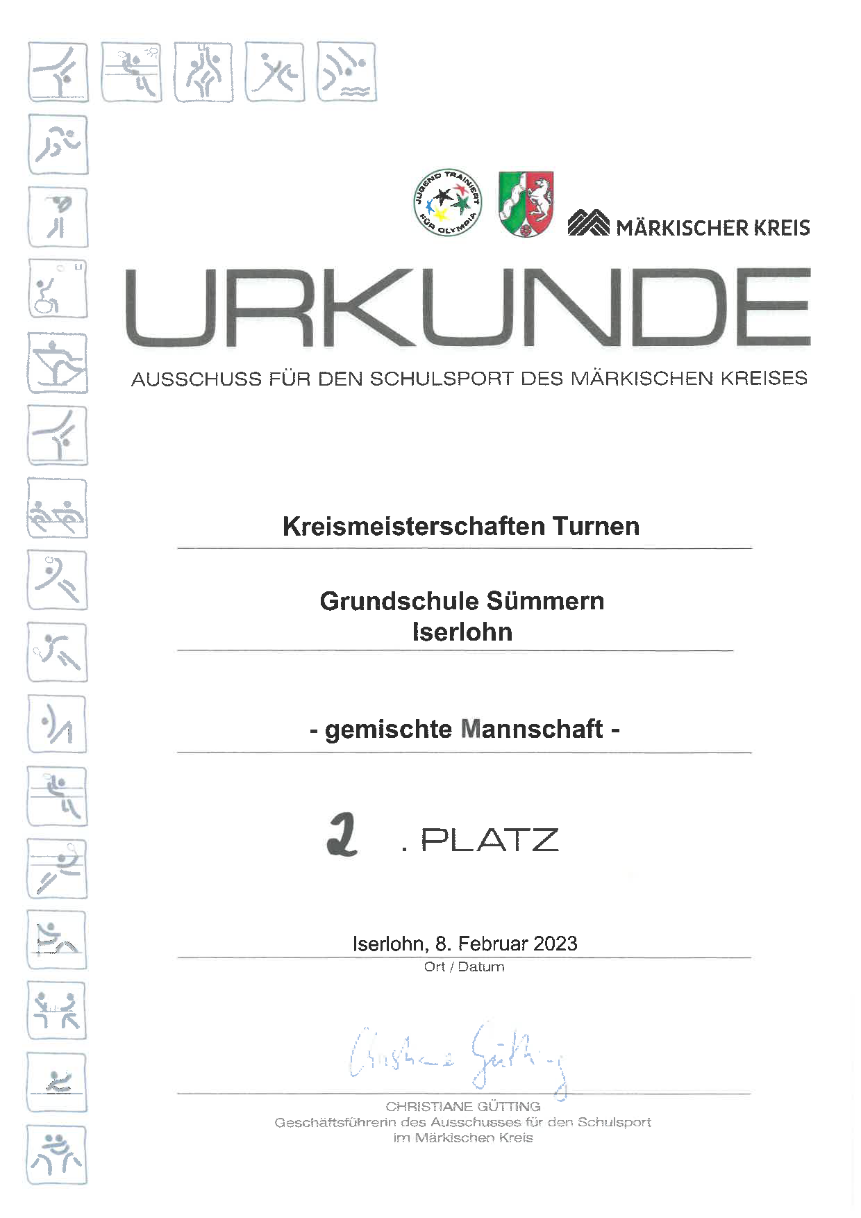 Im Anschluss des Tuniers wurde die Kooperationsvereinbarung unterzeichnet. (Foto: Schulleiterin Anke Luther und Abteilungsleiter des TUS Iserlohn Hockey Hans-Jürgen Becker) Die Grundschule Sümmern und der TUS Iserlohn Hockey bekunden mit dieser Vereinbarung ihre feste Absicht, neue Impulse für die sportliche Förderung von Kindern zu geben mit dem Ziel, eine sportliche Grundausbildung der Kinder im Bereich Hockey zu erreichen.